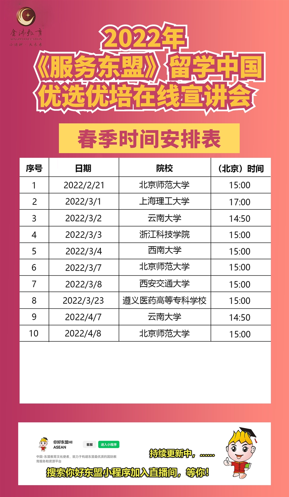 2022年2月21日起由我司聯(lián)合多所高校開展的“2022年春季留學(xué)中國優(yōu)選優(yōu)培線上直播宣講會(huì)”將在“你好東盟”微信小程序上進(jìn)行開播。