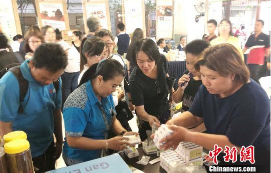 ▲圖為由中國知名中成藥企業(yè)主辦的一場(chǎng)活動(dòng)中,印尼民眾爭相購買太極藿香正汽口服液。鐘欣 攝