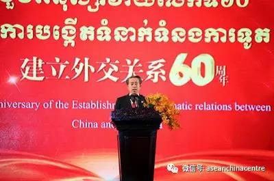 2018年7月2日,駐柬埔寨使館在金邊鉆石島會堂隆重舉辦中柬建交60周年紀(jì)念招待會。柬埔寨王國政府首相洪森及夫人文拉妮、5位副首相、柬王室帕花黛薇公主、柬中友協(xié)主席艾桑奧、國務(wù)兼外交大臣布拉索昆等20余位政府部長、有關(guān)國家駐柬使節(jié)、華僑華人代表以及各界友好人士500余人出席。