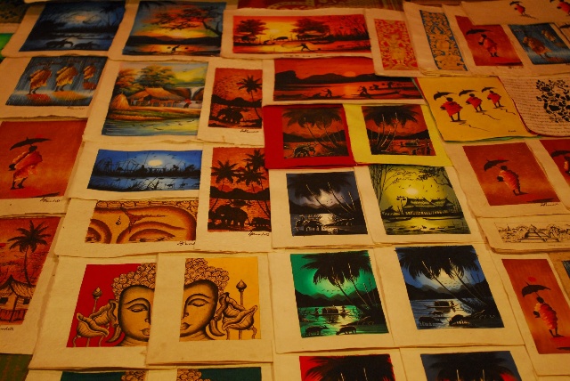 老撾原生態(tài)的手工藝造紙非常有名,也是在市場(chǎng)上最常見的一種工藝品,包括紙畫、紙燈罩、名信片、筆記本等種類。這種紙質(zhì)藝術(shù)品的繪畫內(nèi)容多與佛教有關(guān),極具老撾特色。