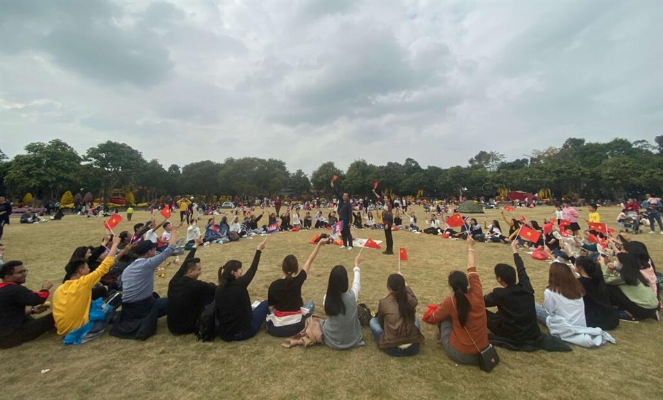 圖為東盟留學(xué)生于青秀山大草坪進(jìn)行游戲互動(dòng)