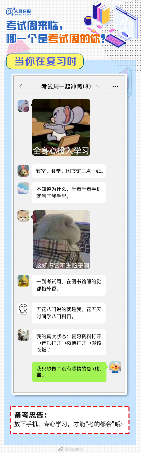 又到考試周,復(fù)習(xí)中的你,狀態(tài)如何?“寢室、食堂、圖書館三點一線”、“一天學(xué)完一本書”、“復(fù)習(xí)到頭禿”…這是考試周的你嗎?