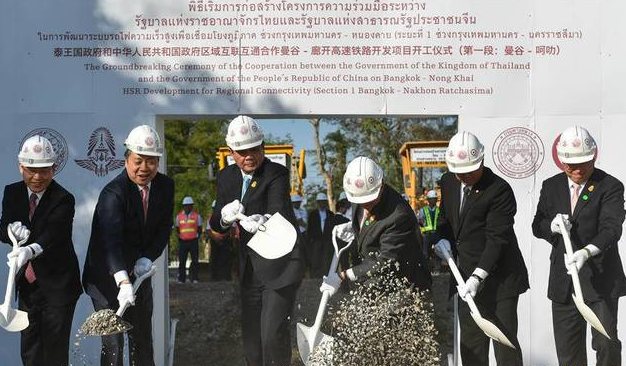 12月21日,泰國總理巴育(左三)與中泰鐵路合作聯(lián)委會(huì)中方主席、國家發(fā)改委副主任王曉濤(左二)等嘉賓們?cè)谔﹪鴸|北部呵叻府巴沖縣舉行的中泰鐵路合作項(xiàng)目一期工程開工儀式上共同鏟土。當(dāng)日,中泰鐵路合作項(xiàng)目一期工程開工儀式在呵叻府巴沖縣舉行。李克強(qiáng)總理向開工儀式發(fā)來賀信。泰國總理巴育親臨現(xiàn)場(chǎng)致辭。中泰鐵路合作聯(lián)委會(huì)中方主席、國家發(fā)改委副主任王曉濤、中國駐泰國大使呂健,泰國交通部長(zhǎng)阿空、內(nèi)政部長(zhǎng)阿努蓬,以及來自中泰政府部門、鐵路管理部門、相關(guān)企業(yè)、媒體等近400人出席開工儀式。新華社記者李芒茫攝