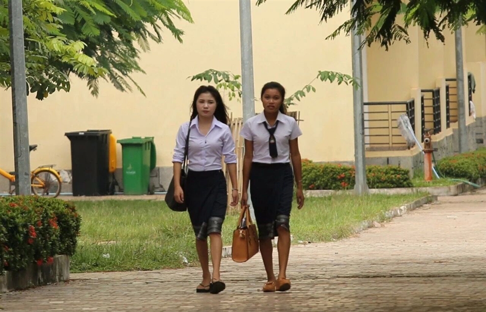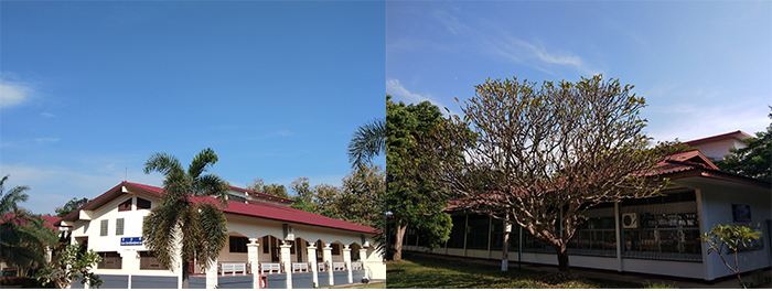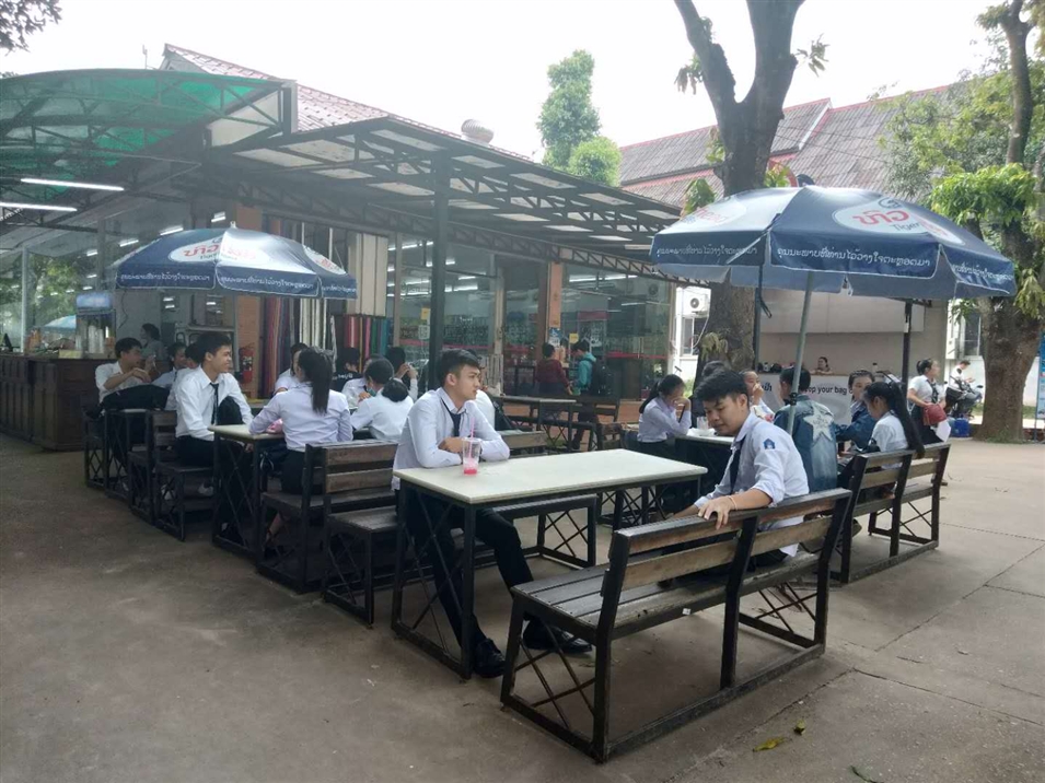 郁郁蔥蔥的東南亞特色的植被中,紅白相間的老撾語教學(xué)樓十分醒目,跳躍在金色陽光下的東南亞特色建筑教室,顯得干凈整潔。