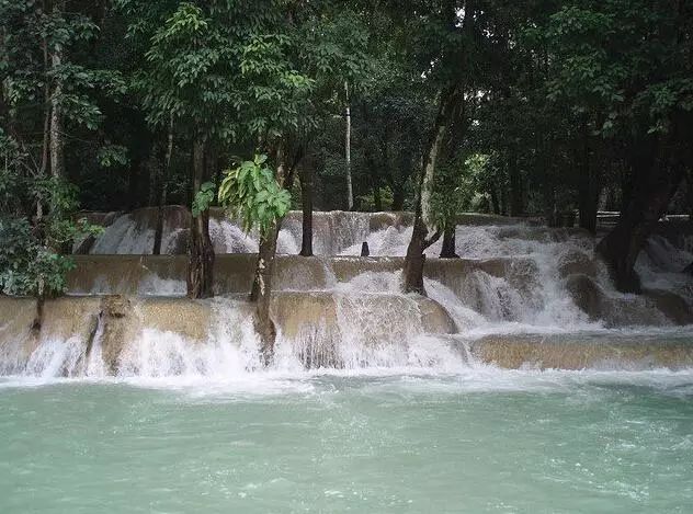 (1)方位:在瑯勃拉邦的南邊大約30km處,是由一個(gè)大瀑布和山下多個(gè)小瀑布組成的瀑布群,總落差100米。