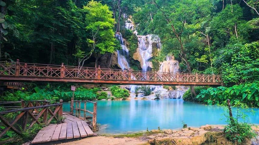 這里是一座寬廣的多層瀑布,瀑布總高100米,瀑布從石灰石山峰傾瀉而下,注入下面一系列清涼、翠綠色的水潭中。三層瀑布傾瀉而下,形成多個(gè)泛著藍(lán)綠色光澤的水潭,這里的景色像極了九寨溝的五彩池。陽(yáng)光透過(guò)樹(shù)葉的間隙灑在涓涓溪流中,溪面就好像是一片片破碎的鏡子,點(diǎn)點(diǎn)地閃爍魚(yú)鱗般的光,如夢(mèng)似幻,讓人迷醉。在這里最熱門(mén)的活動(dòng)莫過(guò)于大樹(shù)繩索跳水,在水潭內(nèi)嬉戲不要著急上岸,可以安靜的在水里享受一下純天然免費(fèi)小魚(yú)SPA。