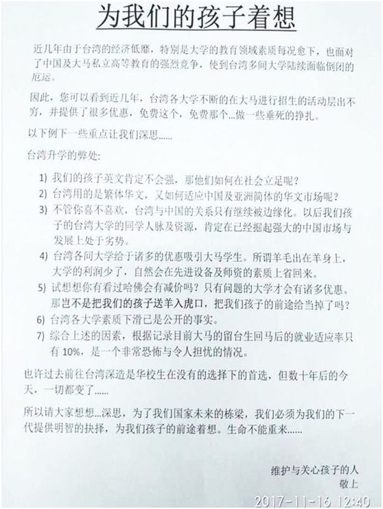 公開信同時列舉臺灣升學(xué)七大弊端,其中第二點(diǎn)是,“臺灣用的是繁體華文,又如何適應(yīng)中國及亞洲簡體的華文市場呢?”第三點(diǎn)是“不管你喜不喜歡,臺灣與中國的關(guān)系只有繼續(xù)被邊緣化。以后我們孩子的臺灣大學(xué)的同學(xué)人脈及資源,肯定在已經(jīng)崛起強(qiáng)大的中國市場與發(fā)展上處于劣勢”。第七點(diǎn)提出臺灣升學(xué)弊端的結(jié)論是,“大馬留臺學(xué)生回到馬來西亞后,就業(yè)率只有10%,是一個非??植琅c令人擔(dān)憂的情況”。